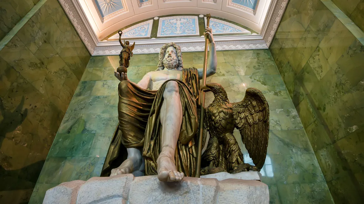 فیدیاس، مجسمهساز آتنی، مجسمهی زئوس، پادشاه خدایان در اساطیر یونان را در اواسط قرن پنجم قم ساخت و تکمیل و در معبد زئوس در المپیا، مکان باستانی رقابتهای المپیک، نصب کرد. این مجسمه بازنمایی خدای رعدوبرق با نیمتنهی برهنه است که روی تختی چوبی تکیه زده است. زئوس دو عصا بهشکل اسفنکسهای حجاریشده را در دست دارد که موجودات اسطورهای با سر و بدن زن، بدن شیر و بالهای پرنده را نمایش میدهند. مجسمهی زئوس با طلا و عاج تزیین شده بود. این مجسمهی ۱۲ متری بهقدری مرتفع بود که سر آن به سقف معبد میرسید. براساس افسانهای، فیدیاس مجسمهساز پس از اتمام این مجسمه از زئوس نشانهای برای تأیید میخواهد و بلافاصله پس از آن رعدوبرقی بر معبد میزند. مجسمهی زئوس بهمدت هشت قرن در معبد المپیا نگهداری میشد تا اینکه مسیحیان در قرن چهارم میلادی به امپراتوری روم در نزدیکی معبد حمله کردند. در آن زمان، مجسمهی زئوس به معبدی در شهر قسطنطنیه منتقل شده بود که بهباور برخی، در سال ۴۶۲ میلادی در آتشسوزی سوخت.